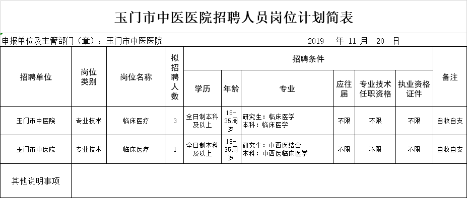 玉门市中医医院招聘人员岗位计划简表