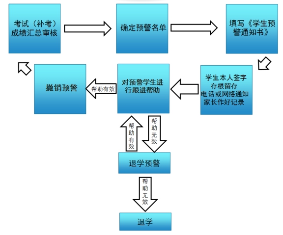 7.预警及退学预警跟进帮助的时间均为一个学期,帮助有效,撤销预警或降低预警等级;若学期内表现或学期末考试仍有上述情况则视为帮助无效,提升预警等级,直至劝退。