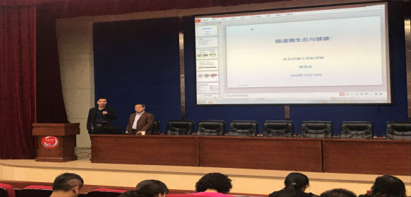 傅思武教授介绍了自己在科研发展方面的研究,并从微观生态学、人体内的微生态系统、肠道菌群参与维生素代谢、导致微生态失衡的主要因素、微生态调节、肠道菌群调节剂—合生素等方面作了详细讲述,并和师生互动,达到了相互学习,沟通交流、拓宽视野的目的。