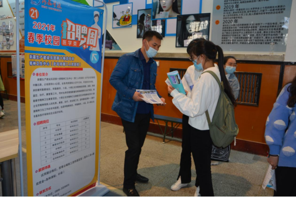 本次双选会参会单位中,包括28家新疆医院、24家省内公立医院、16家省内外民营医院、12家医疗卫生行业公司(医药公司、医疗器械公司、产后恢复中心、健康管理公司等),提供岗位涵盖公司2021届医学类毕业生所有专业。双选会期间,公司党政负责人带领辅导员、毕业班班主任与用人单位面对面交流对接,推介毕业生,并对招聘需求、实习带就业等问题进行沟通交流。双选会期间还举行了新疆员工报告会活动,2010级员工石杰、2015级员工赵宝通用朴实的语言讲述了入疆后的工作生活经历,生动的展现了公司员工在新疆成家、立业的情况,引领公司员工进一步认识新疆,选择新疆,到新疆去奉献智慧,施展才华,实现自己的人生价值。