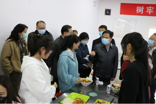 狄生奎一行深入杏林餐厅,认真查看人员管控、入厅测温、间隔购餐、间隔就餐以及通风、消毒、卫生等疫情防控情况,听取相关部门关于员工就餐安全措施落实情况的汇报,与就餐员工面对面交流,了解员工对饭菜的质量、价格的意见,并在教职工餐厅与师生一同就餐。