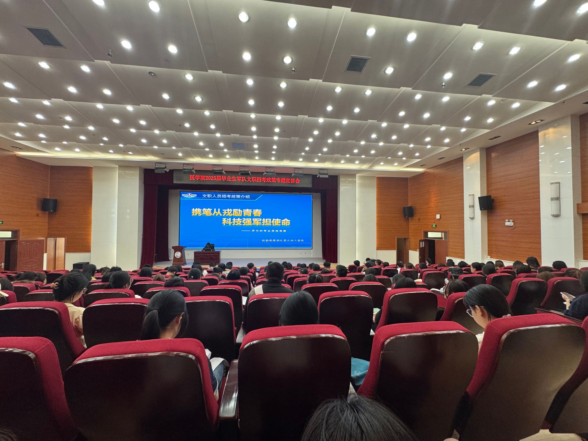 宣讲会上,毛雪梅以“携笔从戎励青春 科技强军担使命”为主题,从军队文职人员定义、招录方式、待遇保障等几个方面详细介绍,并现场展示军队医疗文职日常工作场景的视频片段。