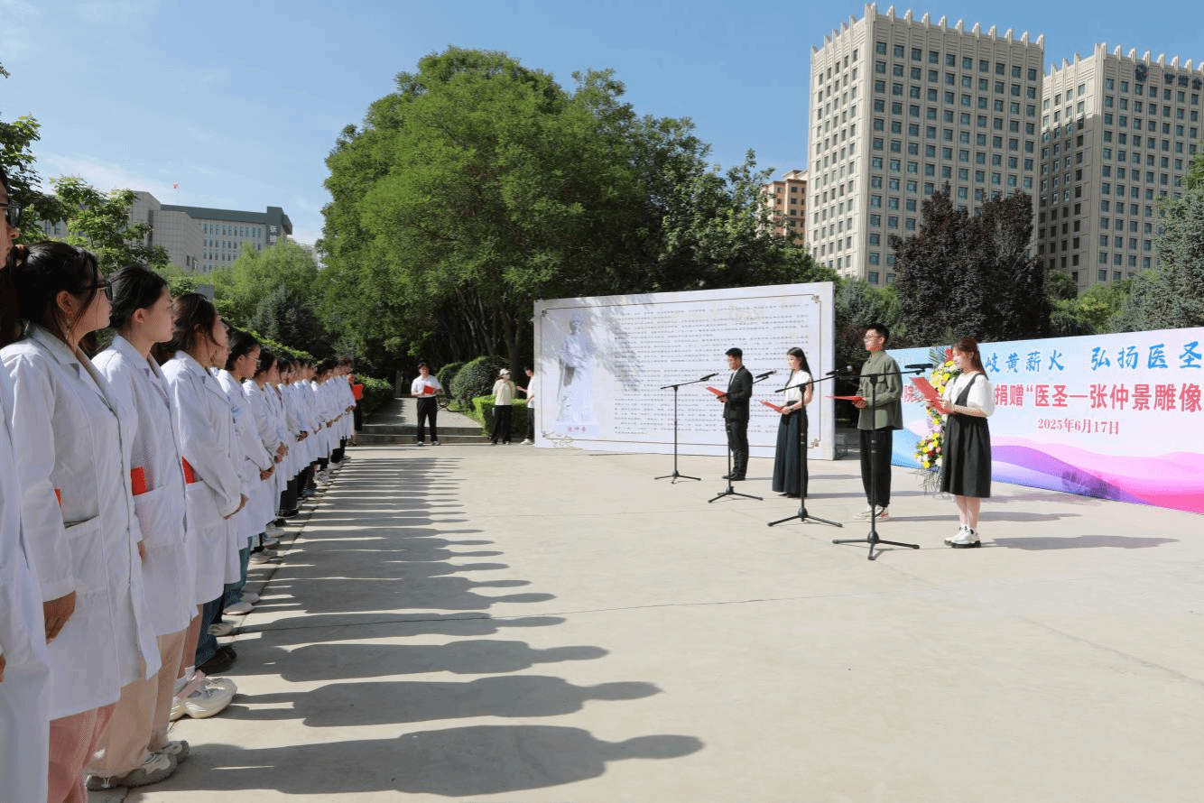 在庄重而神圣的氛围中,随着老师的引领,在场全体师生齐声诵读起《伤寒论》的经典篇章,那古老而深邃的文字,仿佛穿越时空,将医圣的智慧与精神传递至每一个人的心田。诵读声中,大家仿佛能感受到张仲景那颗为医为民的赤子之心,那份对医学事业的执着追求。这一刻,经典与传承在这里交汇,激励着每一位毕业生在未来的医学道路上,不忘初心,砥砺前行,将医圣的精神发扬光大,为人类健康事业贡献自己的力量。