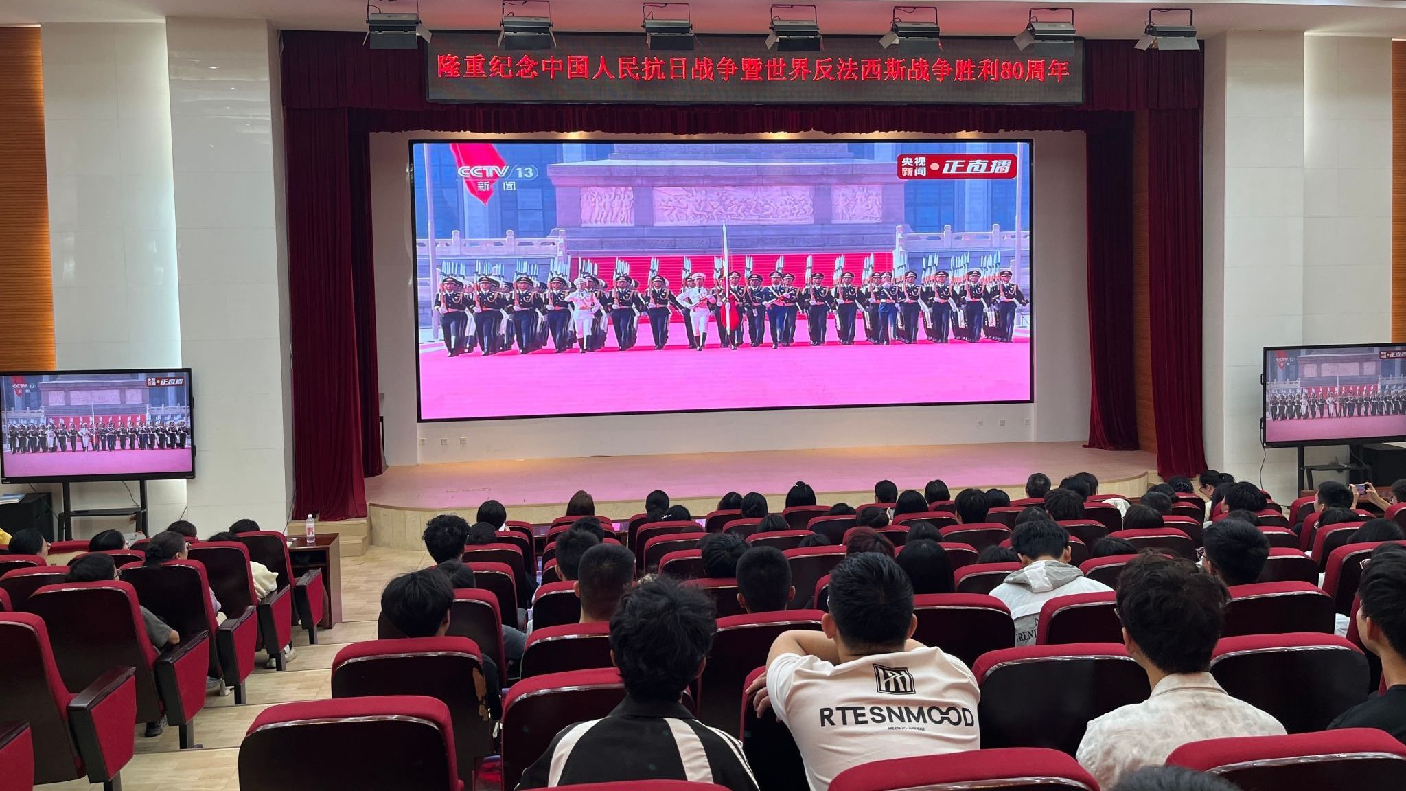 9月3日上午,公司组织教师代表、师生党员代表、团员代表、员工代表近260余人集中观看纪念中国人民抗日战争暨世界反法西斯战争胜利80周年大会现场直播。
