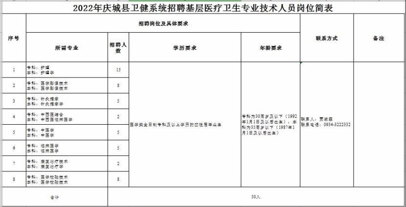 全县共计划招聘医学类专业技术人员50名,其中临床医学5人、中医学5人、中西医结合2人、医学检验技术8人、医学影像技术8人、护理15人、康复治疗技术2人、针灸推拿5人,具体要求详见岗位简表(附件1)。