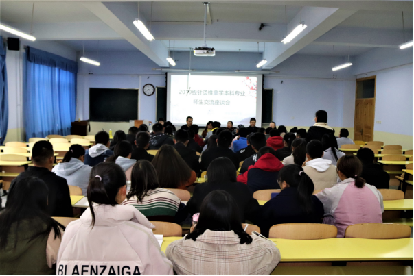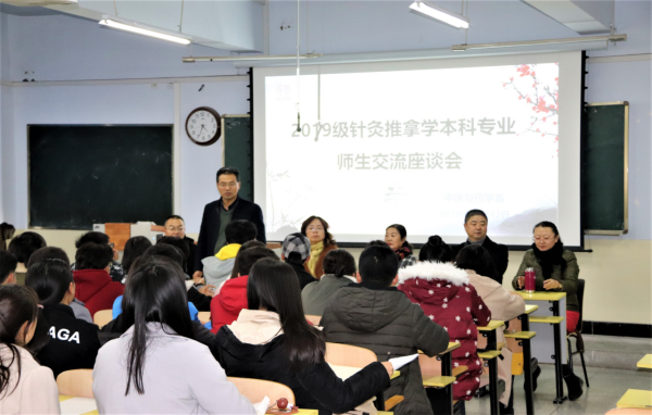 11月12日下午,中医与药学系2019级针灸推拿学本科师生交流座谈会在教学楼204教室举行,中医与药学系主任魏庆华教授,中医针推教研室姚兰、高仰来、李秀、闫立国、王莉、葛生虎、卜少伟、张雅娴老师及针灸推拿学191班员工齐聚一堂,围绕员工思想、学习和生活中的问题进行交流。