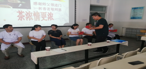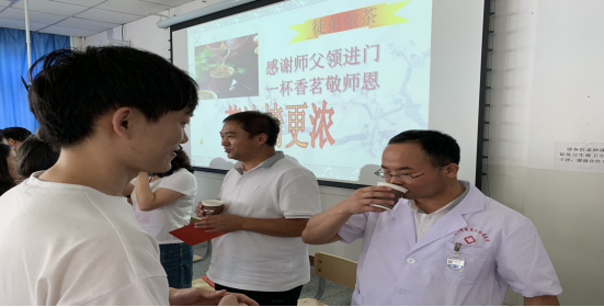 会议中,医学技术系负责人向每一位指导老师颁发聘书,各毕业生代表向各自的指导老师敬茶、拥抱,行拜师礼。