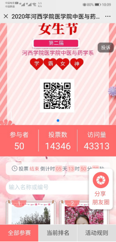 本届活动依托女生节这一契机,将团结友爱、互帮互助的浓烈气氛通过网络在中医与药学系迅速播撒开来,并在全系上下形成了一股赶超比拼的学习热潮。让每一位同学们在疫情防控的日子里感受到了一个别样温暖的春天,更让每一个女生在女生节这个属于自己的节日里拥有一个美好的回忆。