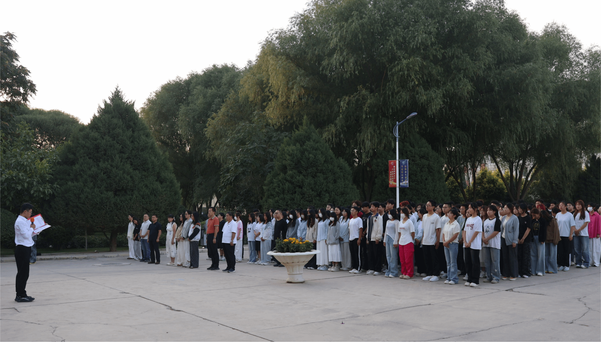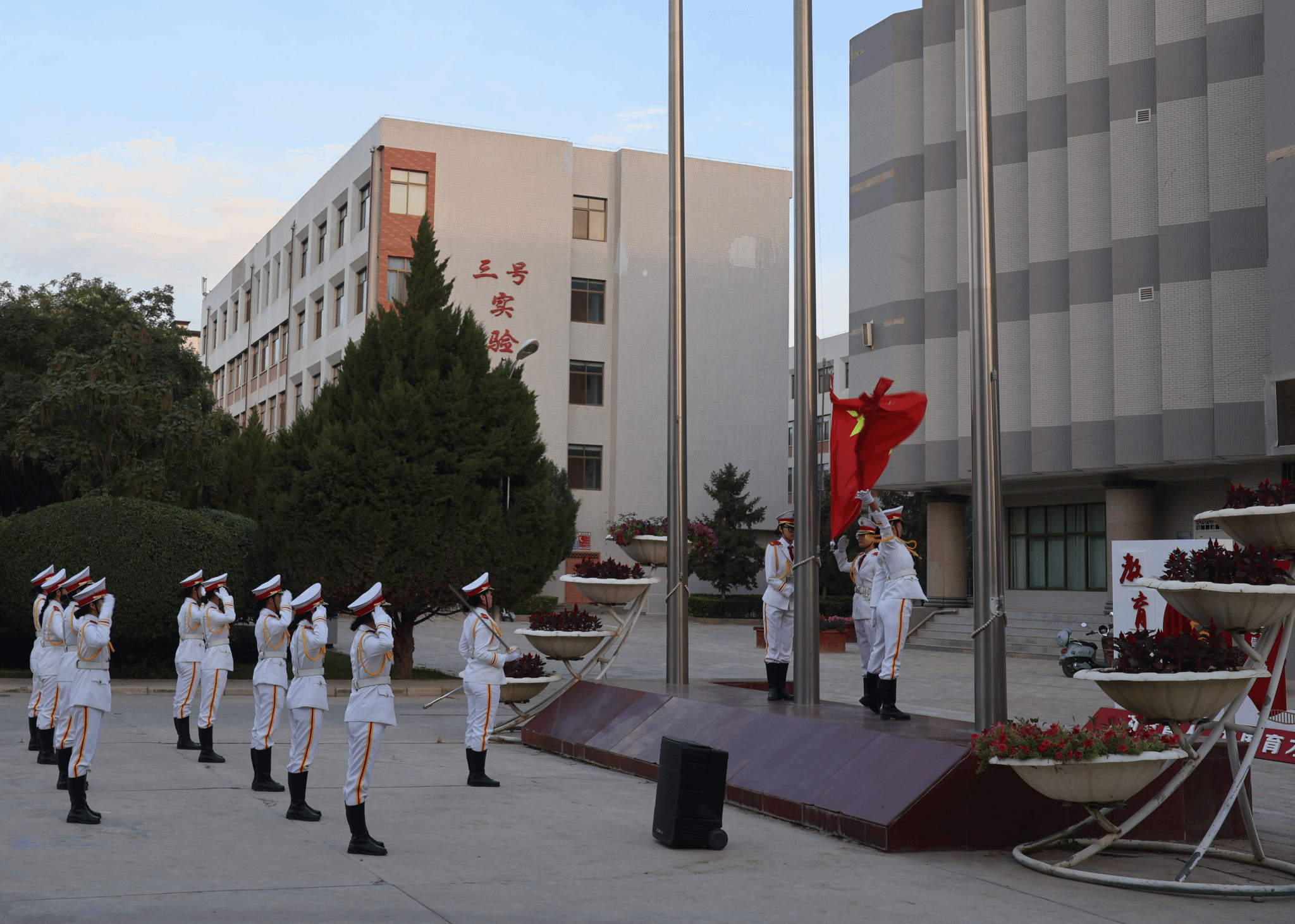 在雄壮激昂的国歌声中,五星红旗冉冉升起,迎风飘扬。全体师生面向国旗肃立,行注目礼,表达对祖国的无限热爱与崇高敬意。